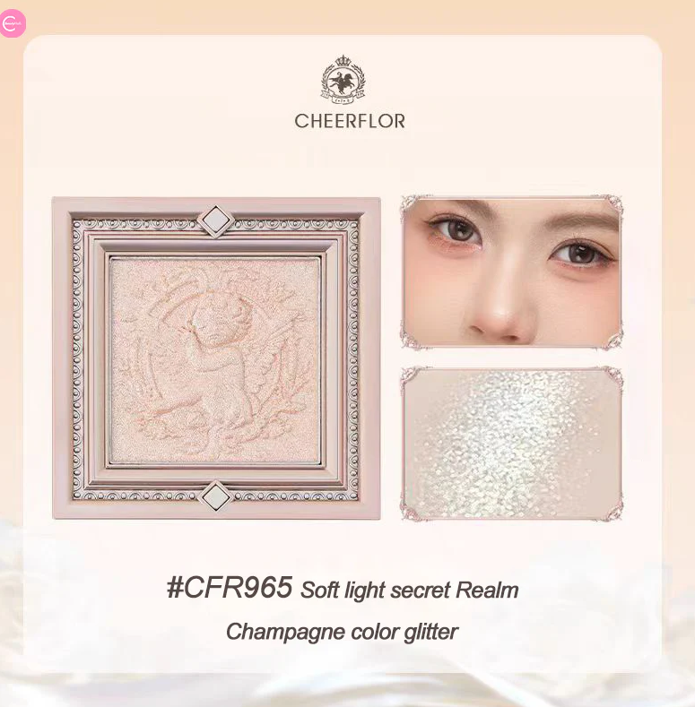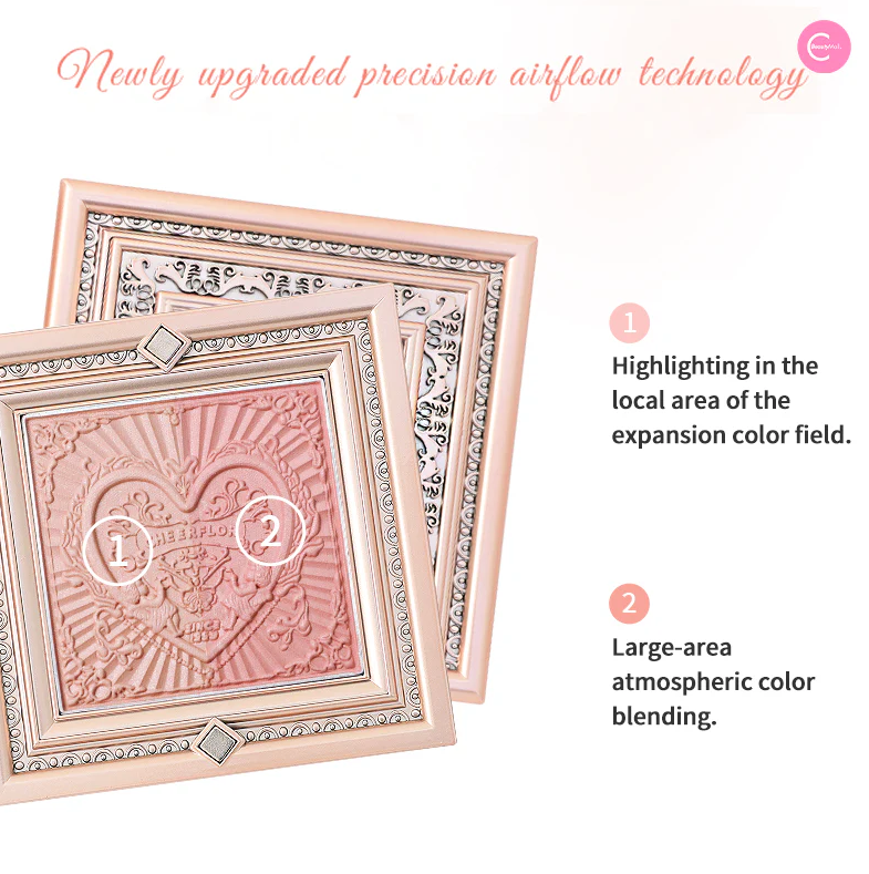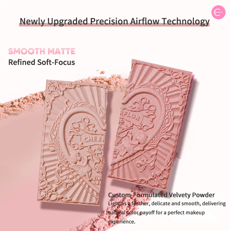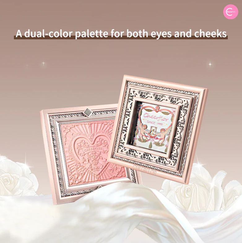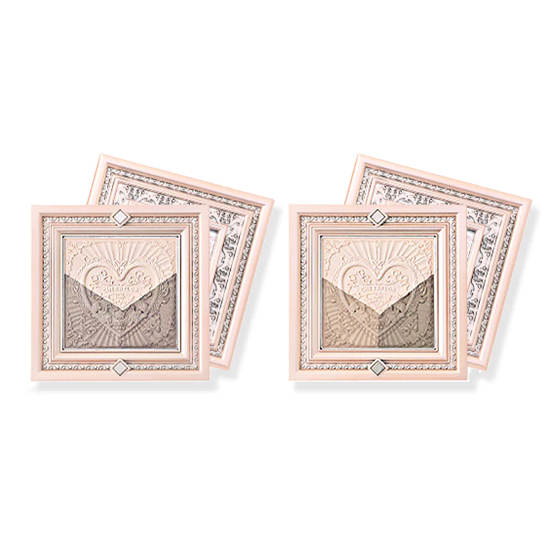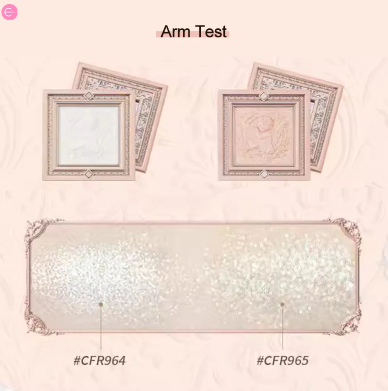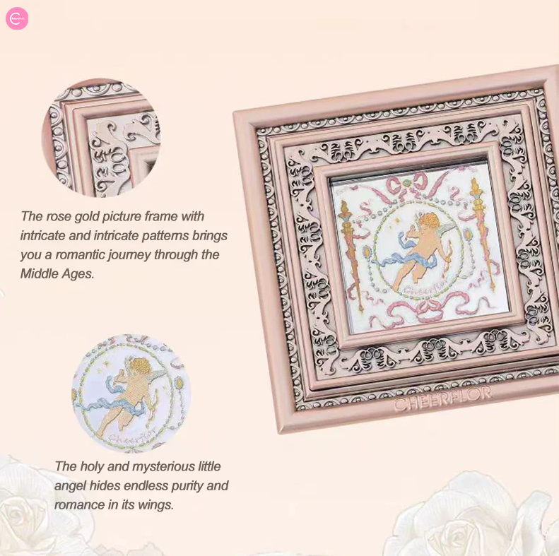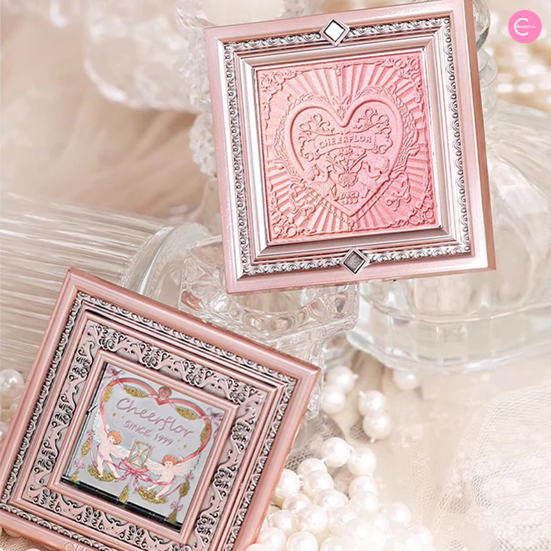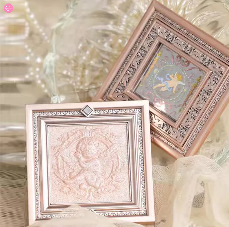 مستحضرات تجميل بودرة مضغوطة تأتي في علب فاخرة مصممة كبراويز لوحات فنية كلاسيكية مع نقوش بارزة على شكل قلوب وملائكة.
