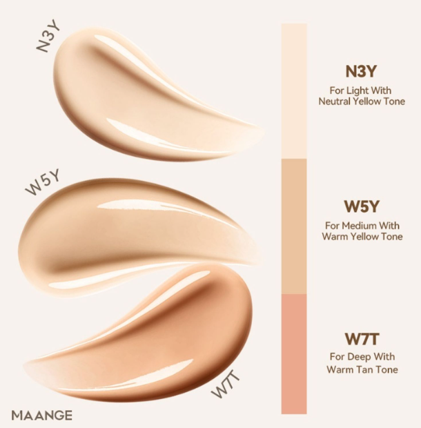 يتوفر بعدة درجات لونية (مثل N3Y، W5Y، W7T) لتناسب مختلف ألوان البشرة ودرجاتها التحتية (Undertones).