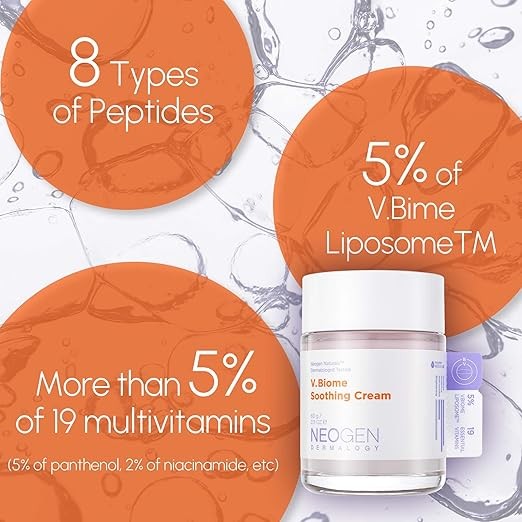 كريم ڤي-بايوم المهدئ من نيوجين هو مرطب فاخر يعمل كعلاج ترميمي للبشرة. بفضل تركيبته الغنية باللايبوسوم والفيتامينات والببتيدات، يمنحك هذا الكريم بشرة هادئة، مغذية، وأكثر شبابًا.