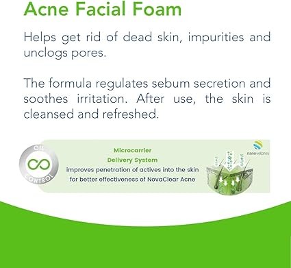 - رغوة الوجه "نوفاكلير أكنه" هي منظف فعال ومُتخصص للعناية بالبشرة المعرضة لحب الشباب. بفضل تركيبتها الفريدة التي تجمع بين مركب التحكم بالزيوت، زيت شجرة الشاي، والألوفيرا، مع فرشاة السيليكون المدمجة، ستُصبح بشرتكِ أكثر نقاءً، توازنًا، وصفاءً، مما يمنحكِ بشرة صحية وواضحة.