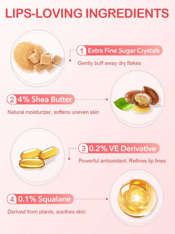 تنعيم الشفاه: يزيل التشققات والخشونة، مما يجعل الشفاه ناعمة كالحرير.
