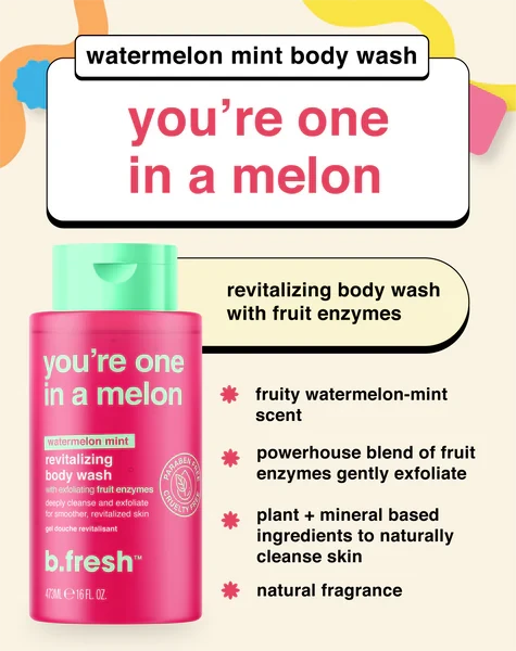 غسول الجسم "يور ون إن أه ميلون" من بي. فريش هو غسول للجسم منعش ومجدد، مصمم لتنقية وتنشيط البشرة. بفضل تركيبته التي تحتوي على أنزيمات الفاكهة المقشرة ورائحة البطيخ بالنعناع، يعمل هذا الغسول على تنظيف البشرة بعمق وتقشيرها بلطف، مما يتركها ناعمة، متجددة، ومفعمة بالحيوية.
