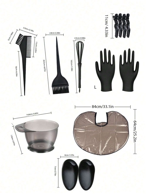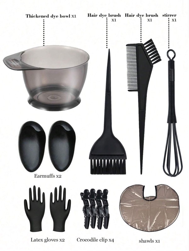 مجموعة صبغ الشعر هذه هي طقم عملي وضروري لكل من يرغب في صبغ الشعر في المنزل أو في الصالون. توفر المجموعة جميع الأدوات الأساسية اللازمة لتطبيق الصبغة بفعالية، دقة، ونظافة، مما يساعد على تحقيق نتائج مرضية مع حماية شخصية للمستخدم.