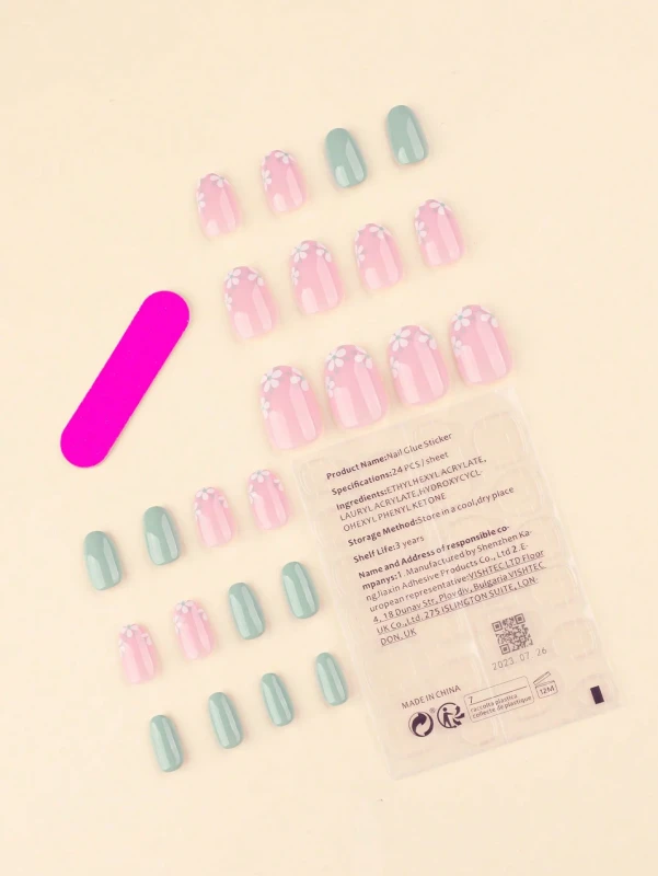 مصممة بتصميم فرنسي رقيق يجمع بين اللون الوردي الفاتح السادة والأخضر المائل للرمادي، بالإضافة إلى أظافر وردية شفافة مزينة برسومات زهور بيضاء صغيرة. تُقدم هذه المجموعة حلًا مثاليًا للحصول على مانيكير احترافي وجذاب دون الحاجة لزيارة صالون التجميل. تأتي المجموعة مع مبرد أظافر صغير لتسهيل التهيئة.
