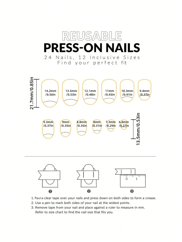 - 24 قطعة بأحجام متنوعة: تحتوي على مجموعة واسعة من الأحجام لتناسب معظم أشكال وأحجام الأظافر الطبيعية، مما يضمن ملاءمة مثالية.
