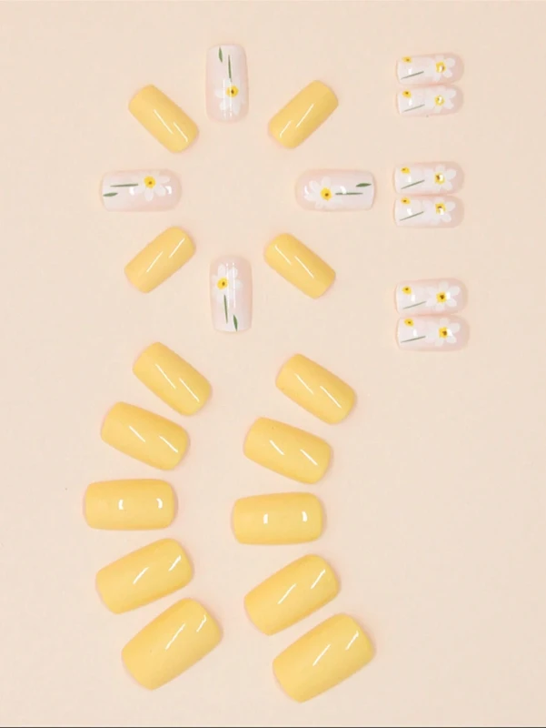 أدخلي أجواء الربيع والصيف المبهجة إلى إطلالتك مع هذه المجموعة الرائعة من الأظافر الصناعية. تتضمن هذه المجموعة 24 قطعة من الأظافر بأحجام مختلفة لتناسب جميع الأظافر، وتتميز بتصميم حيوي يجمع بين اللون الأصفر الزاهي والأظافر بلون بيج فاتح/وردي فاتح مزينة برسومات زهور صغيرة بيضاء وصفراء. هذه الأظافر مثالية لمن تبحث عن مانيكير مشرق ومبهج لموسم الأعياد أو الأيام المشمسة دون الحاجة لزيارة صالونات التجميل.