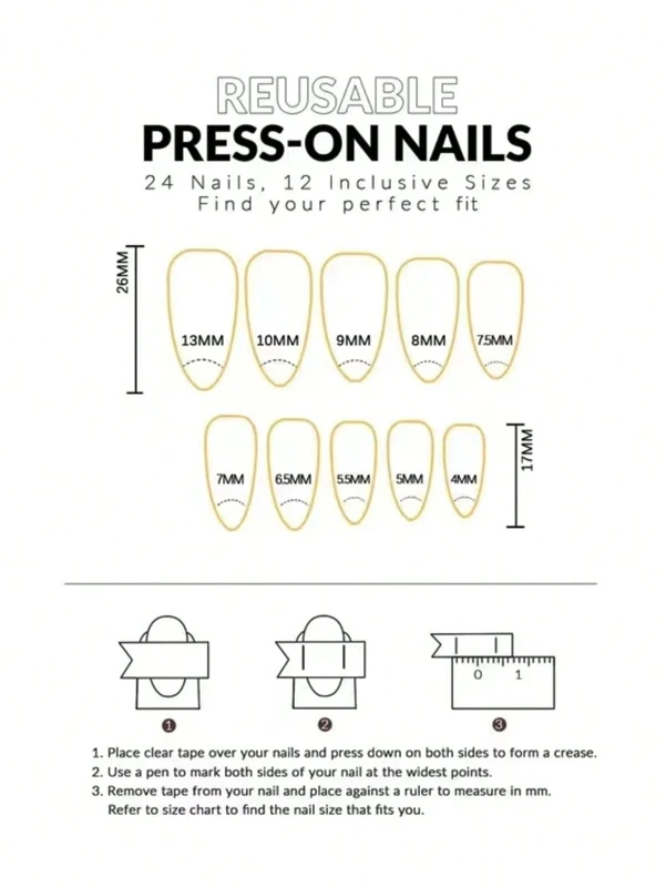 - 24 قطعة بأحجام متنوعة: تحتوي على مجموعة واسعة من الأحجام لتناسب معظم أشكال وأحجام الأظافر الطبيعية، مما يضمن ملاءمة مثالية.