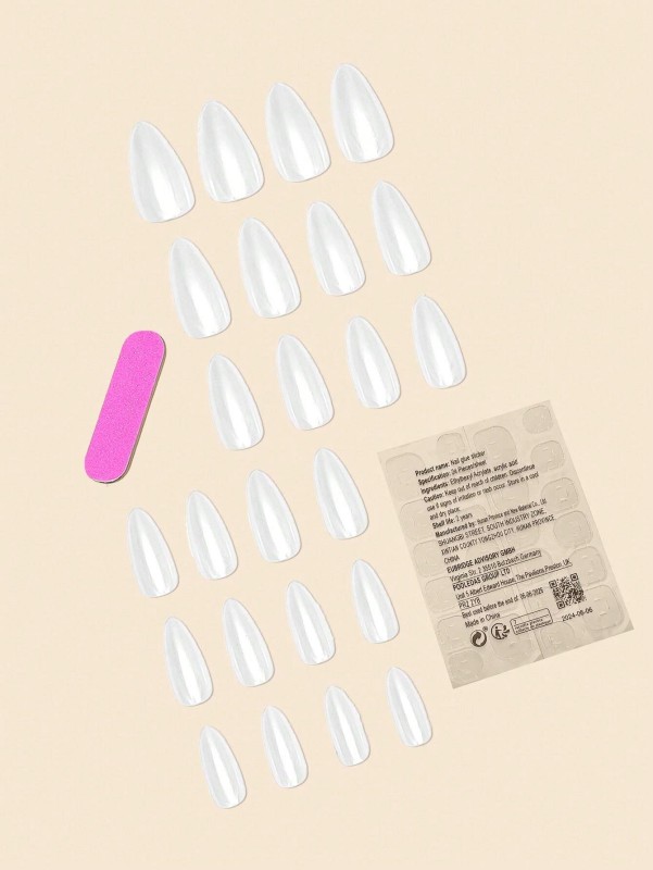 جميعها بلون أبيض شفاف مع لمعة لؤلؤية خفيفة، وبتصميم أنيق على شكل اللوز. يُضفي هذا الشكل على الأظافر مظهرًا رشيقًا وممتدًا، بينما يُعطي اللون الشفاف الأبيض إحساسًا بالنظافة والبساطة الراقية، مما يجعلها قاعدة مثالية للعديد من التصاميم أو للاستخدام بمفردها لمظهر طبيعي لامع. تُعد هذه الأظافر حلًا مثاليًا للحصول على مانيكير عصري وجذاب دون الحاجة لزيارة صالون التجميل. تأتي المجموعة مع مبرد أظافر لتسهيل التهيئة.