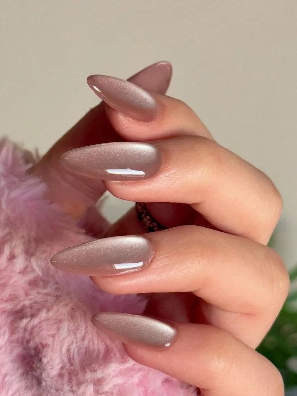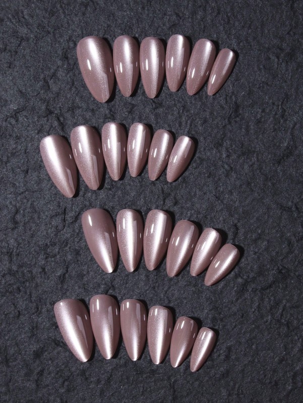 تتميز بلون شمبانيا متلألئ أو بني مائل للوردي مع تأثير "عين القط" اللامع، مما يُضفي عليها لمعانًا فريدًا يتغير مع الضوء. الأظافر مصممة بشكل اللوز المتوسط أو المدبب قليلًا، وهو شكل عصري يُضفي على اليدين مظهرًا رشيقًا وجذابًا. تُعد هذه الأظافر حلاً مثاليًا للحصول على مانيكير فاخر ومميز دون الحاجة لزيارة صالون التجميل، مع ضمان السهولة في التركيب والجودة.