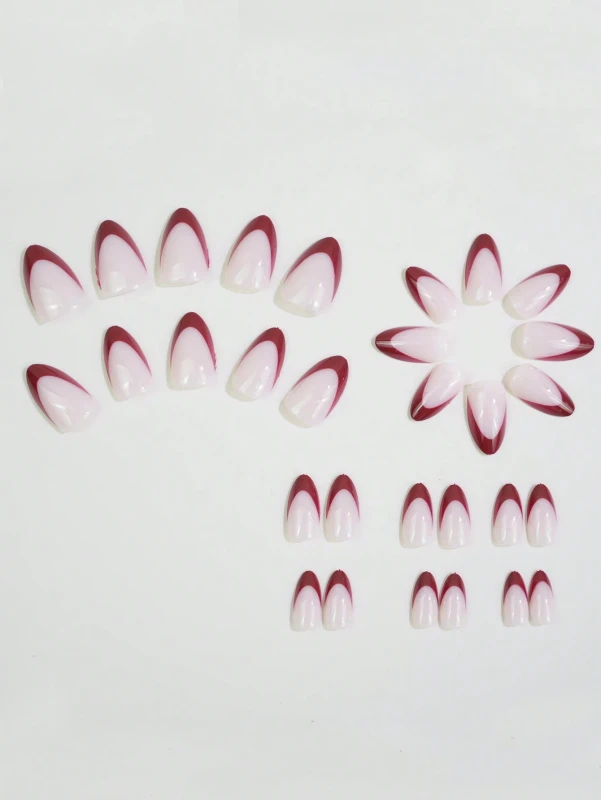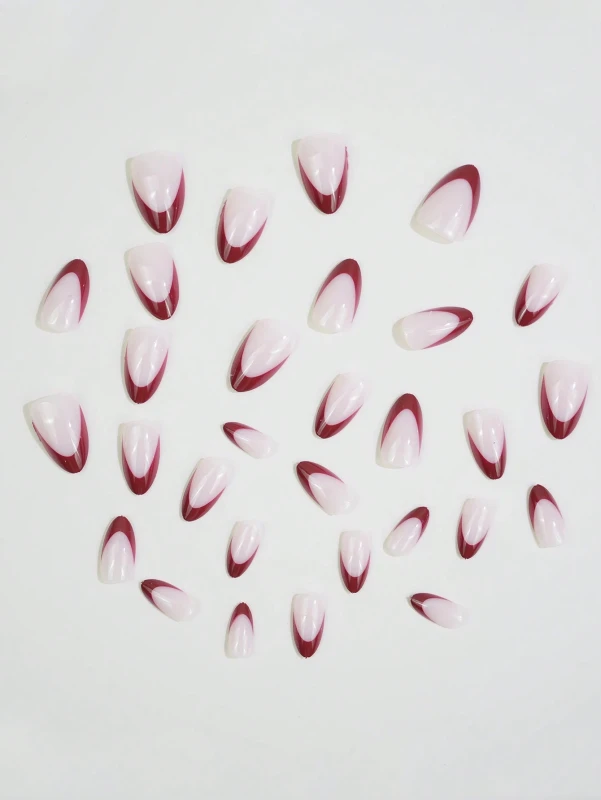 - تصميم فرنسي مبتكر: يجمع بين كلاسيكية المانيكير الفرنسي التقليدي وأطراف بلون كستنائي أو أحمر داكن وشكل مدبب، مما يخلق مظهرًا جريئًا وعصريًا.