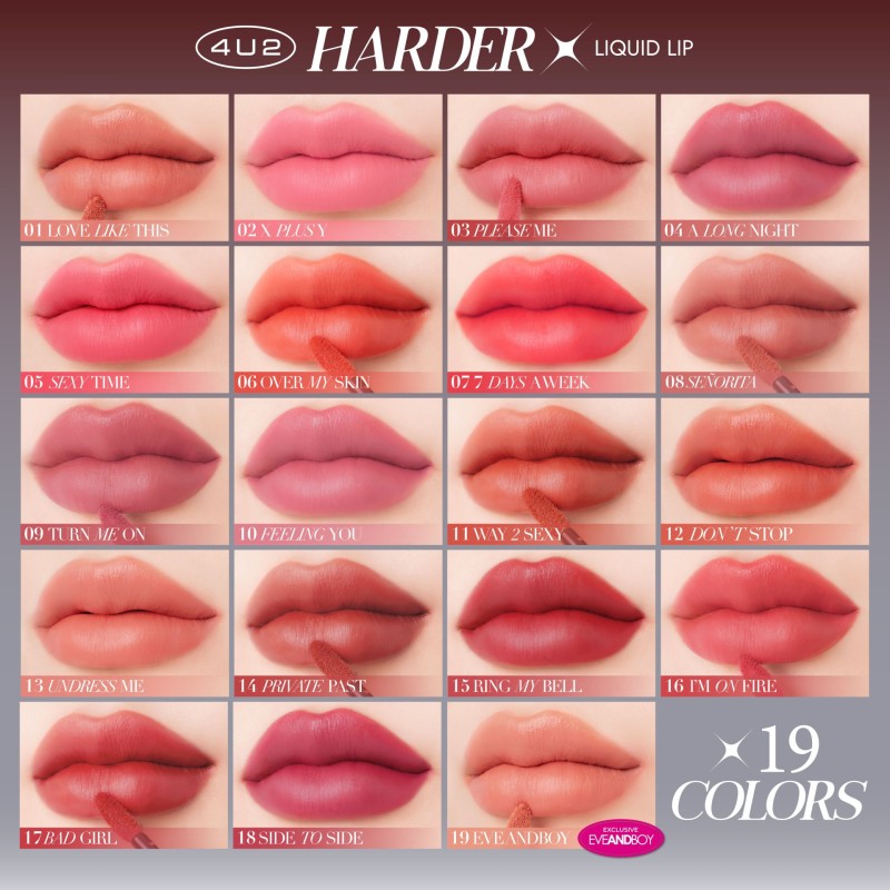 4U2 HARDER Liquid Lip هو أحمر شفاه سائل يجمع بين اللون الغني، الثبات الفائق، والمظهر المريح، ليمنحكِ شفاه جريئة وجذابة تدوم طوال اليوم. بفضل تشكيلة ألوانه الواسعة وتركيبته المبتكرة، فإنه الخيار الأمثل لكل من تبحث عن أحمر شفاه يكمل إطلالتها بثقة وتألق. اختاري لونكِ المفضل، ودعي شفاهكِ تتحدث!