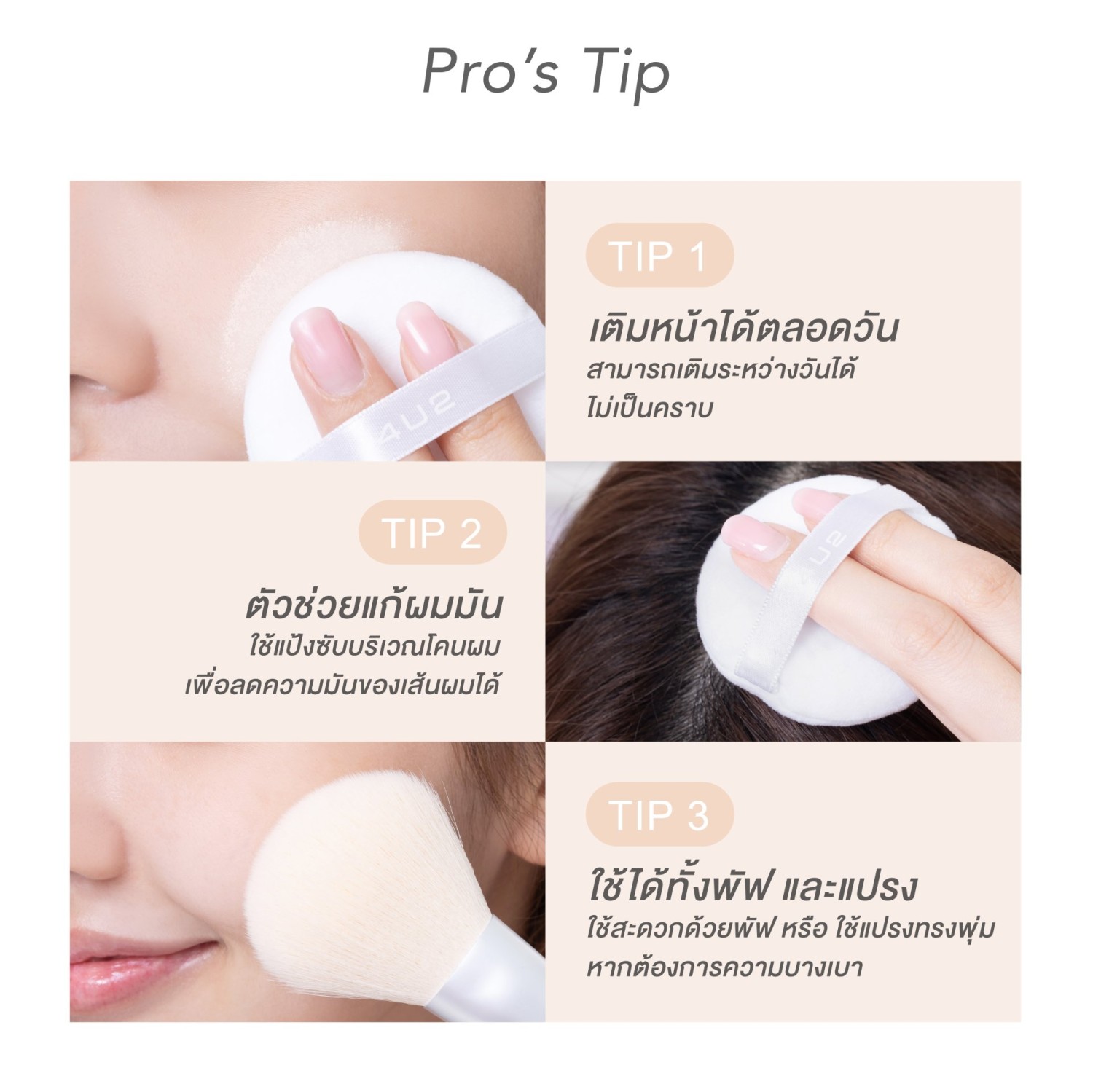 التطبيق والتربيت: ربتي البودرة بلطف على وجهكِ، مع التركيز بشكل خاص على منطقة T-zone (الجبين، الأنف، الذقن) والمناطق التي تميل إلى اللمعان الزائد.