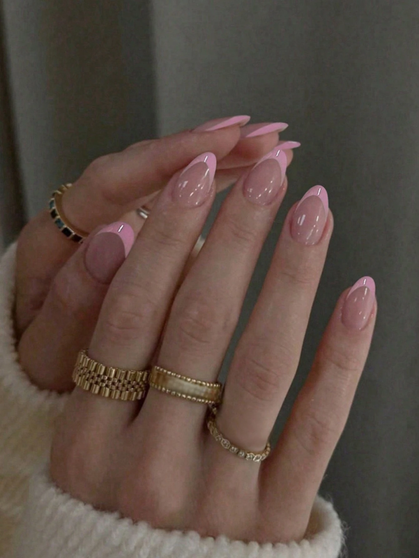 تتميز بتصميم فرنسي كلاسيكي بقاعدة شفافة أو بلون وردي طبيعي، مع أطراف أنيقة بلون وردي فاتح (بيبي بينك) أو وردي مائل للبنفسجي. الأظافر مصممة بأشكال متنوعة تشمل شكل اللوز المدبب والأشكال الأكثر استدارة قليلاً، مما يُضفي على اليدين مظهرًا رشيقًا وأنثويًا. تُعد هذه الأظافر حلاً مثاليًا للحصول على مانيكير احترافي وجذاب في المنزل، مناسب للمناسبات المختلفة أو لإضفاء لمسة رقيقة على إطلالتكِ اليومية.