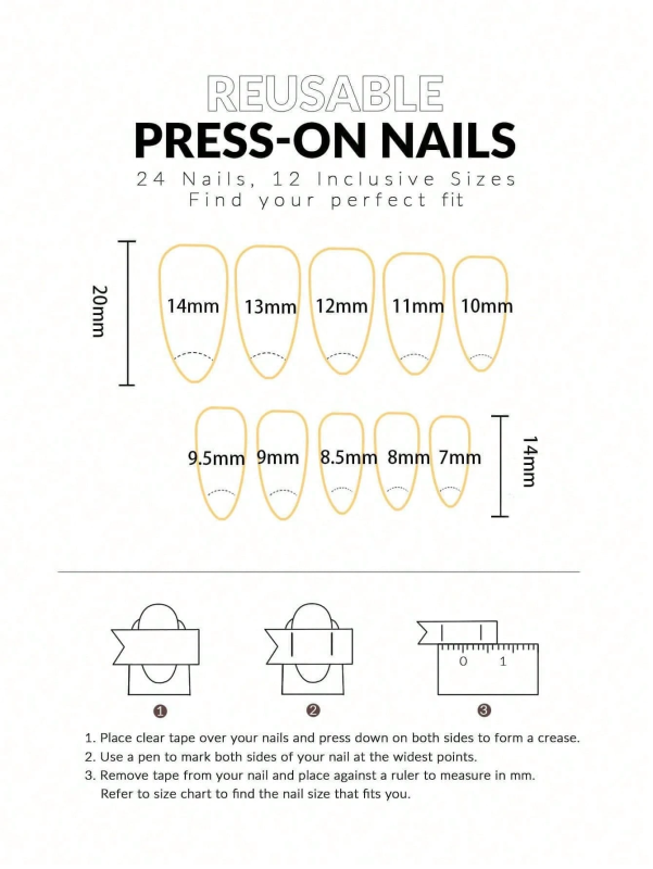 - 24 قطعة بأحجام متنوعة: توفر مجموعة واسعة من الأحجام لتناسب معظم أشكال وأحجام الأظافر الطبيعية، مما يضمن ملاءمة مثالية.