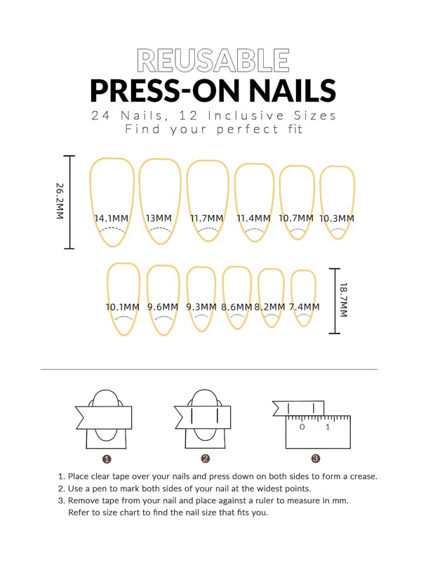 - 24 قطعة بأحجام متنوعة: توفر مجموعة واسعة من الأحجام لتناسب معظم أشكال وأحجام الأظافر الطبيعية، مما يضمن ملاءمة مثالية.