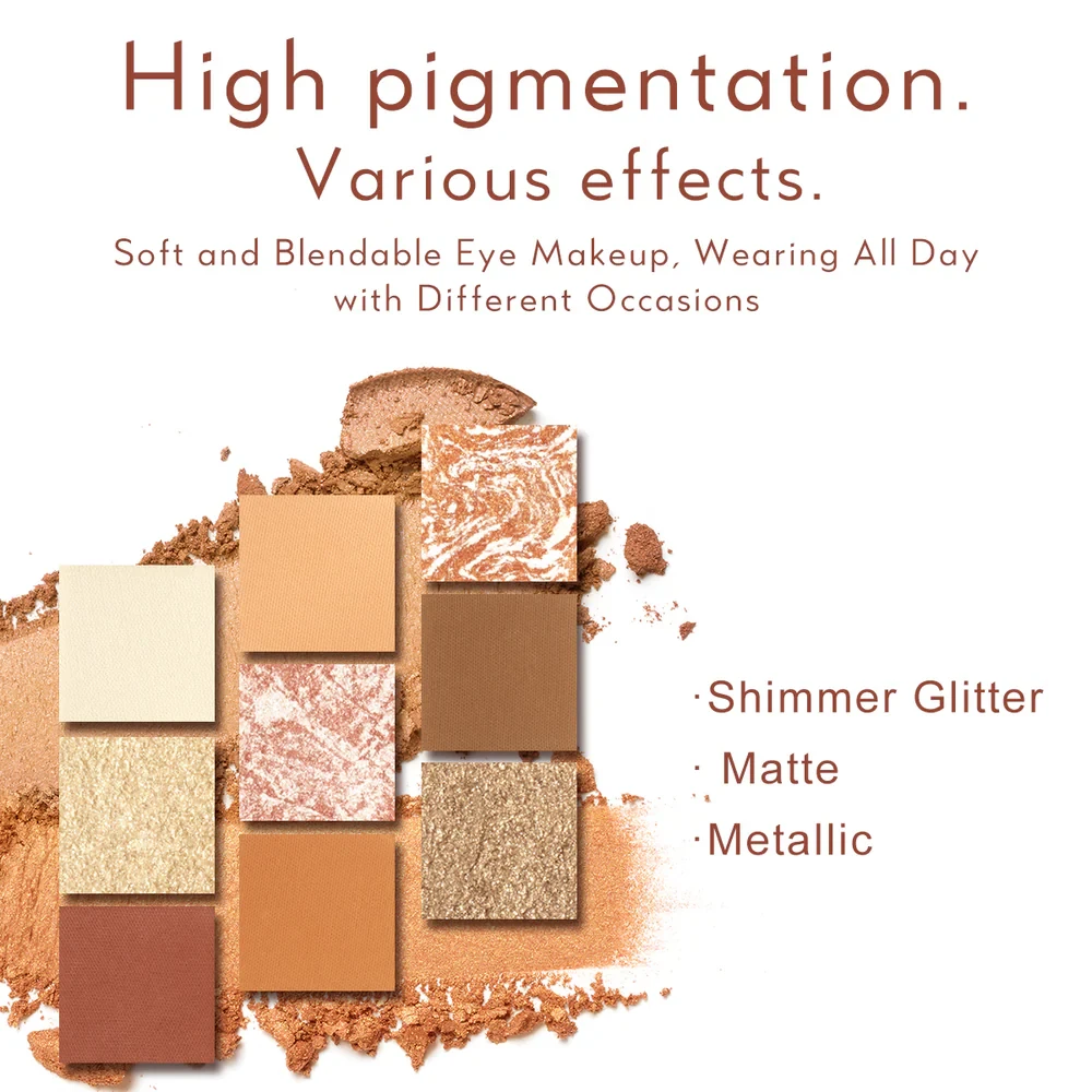 تحتوي هذه الباليت على 9 ألوان بدرجات البرتقالي، البني، الذهبي، مع ظلال لامعة ومطفية.