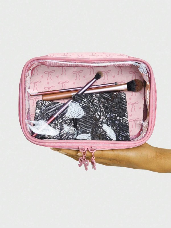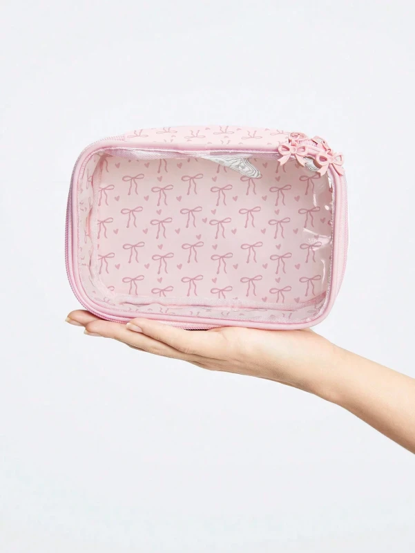 الحقيبة الأنيقة والعملية الحل الأمثل لتنظيم وعرض مستحضرات مكياجكِ وأدوات جمالكِ بأناقة. تتميز الحقيبة بتصميمها الشفاف الذي يُمكنكِ من رؤية جميع محتوياتها بوضوح، مما يُسهل العثور على ما تحتاجينه بسرعة. مصنوعة من مواد متينة، وتُزيّنها نقشات فيونكات وقلوب وردية صغيرة، بالإضافة إلى فيونكة ثلاثية الأبعاد على السحاب، مما يُضفي عليها لمسة أنثوية ورقيقة. بفضل تصميمها المُدمج ومساحتها الداخلية الجيدة، تُعد هذه الحقيبة إضافة لا غنى عنها لروتين جمالكِ، سواء في المنزل أو أثناء التنقل