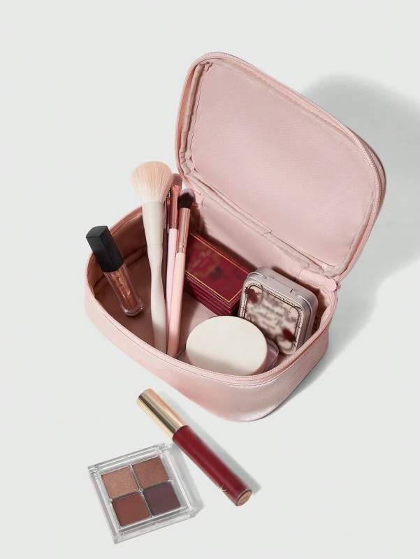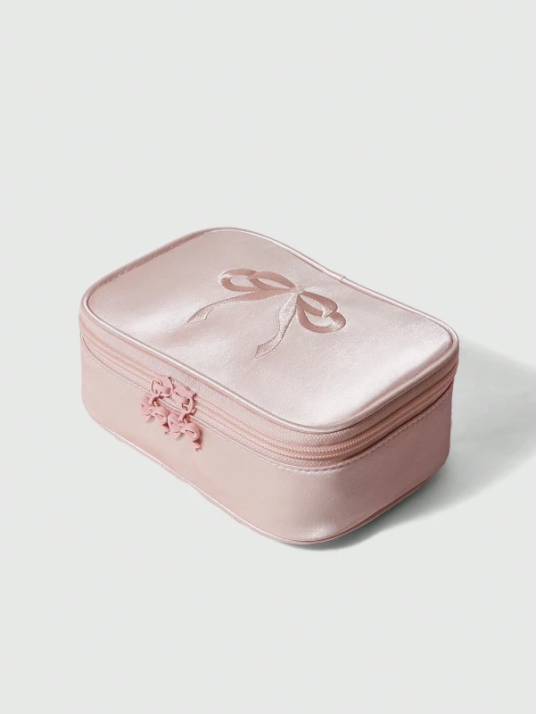 الحقيبة الفاخرة والعملية الحل الأمثل لتنظيم وحفظ أدوات ومستحضرات مكياجكِ بأناقة ورقي. تتميز الحقيبة بتصميمها المصنوع من قماش الساتان الناعم بلون وردي فاتح أو خوخي، مما يُضفي عليها مظهرًا لامعًا وراقيًا. تُزيّنها فيونكة مطرزة بشكل بارز على الغطاء العلوي، بالإضافة إلى سحابات أنيقة على شكل فيونكات، مما يُعزز من جمالها وتفردها. بفضل تصميمها المُدمج ومساحتها الداخلية المنظمة، تُعد هذه الحقيبة إضافة لا غنى عنها لروتين جمالكِ، سواء في المنزل أو أثناء السفر.