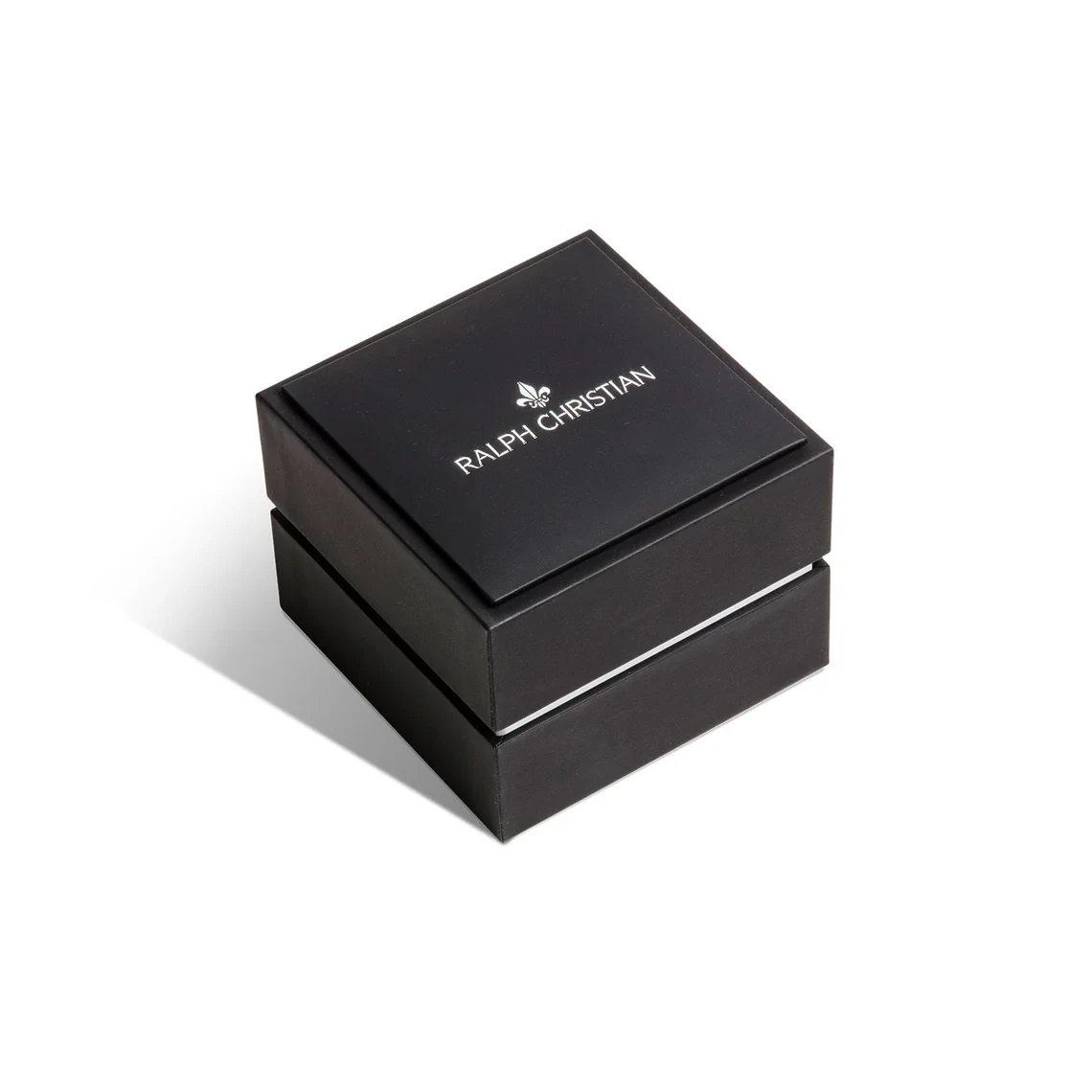 - المؤشرات والأرقام : تتميز الساعة بأرقام رومانية كبيرة وبارزة، غالبًا ما تكون بلون ذهبي أو ذهبي فاتح، موضوعة على حلقة خارجية حول الميناء الهيكلي، مما يضمن سهولة قراءة الوقت رغم تعقيد التصميم الداخلي. يظهر شعار Ralph Christian الأنيق، الذي يتضمن زهرة الزنبق (Fleur-de-lis)، في الجزء العلوي من القاعدة .