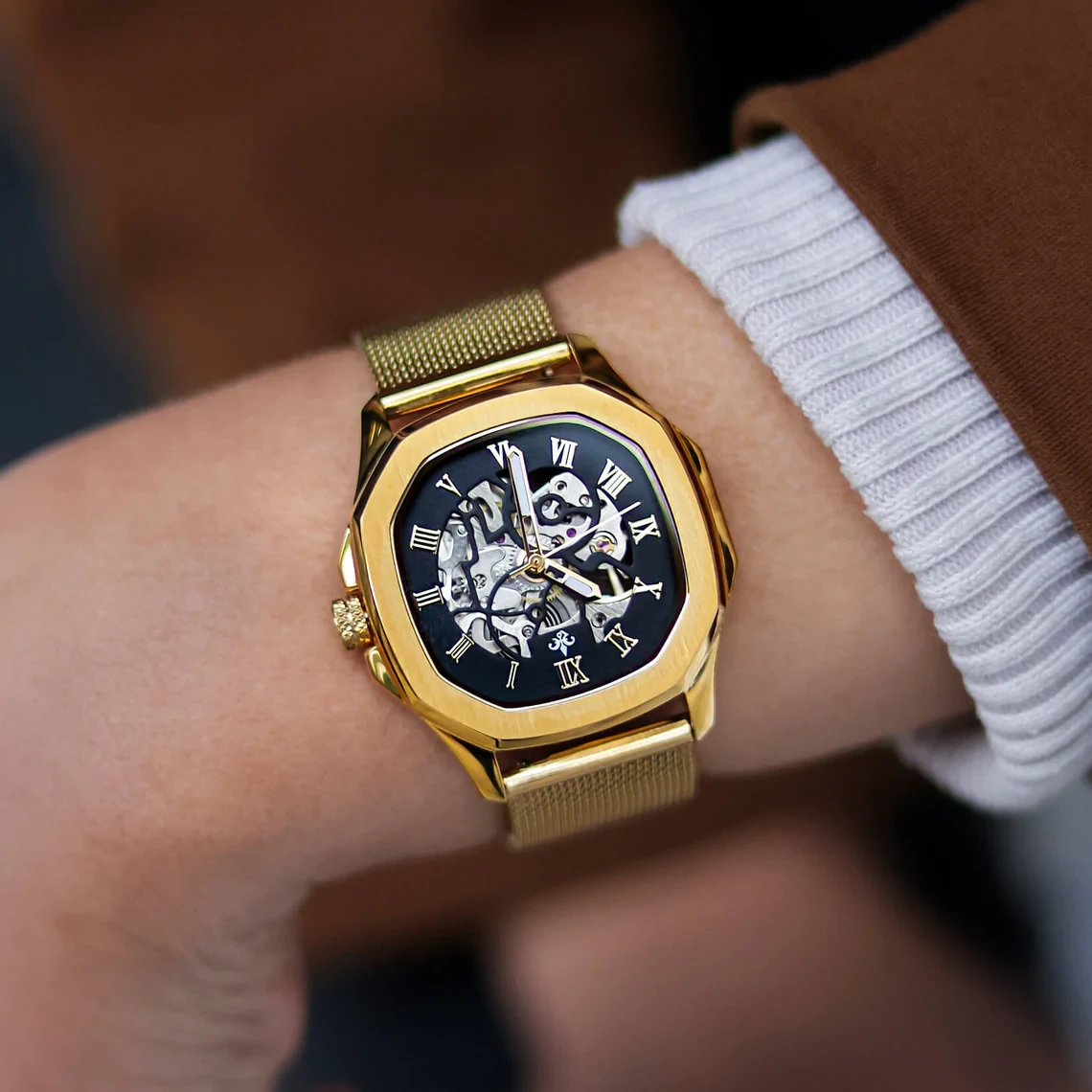 تتميز هذه الساعة بتصميم جريء ومميز، يجمع بين الفخامة الكلاسيكية والشفافية الحديثة، وهي مصممة لتكون قطعة فنية تبرز على المعصم.