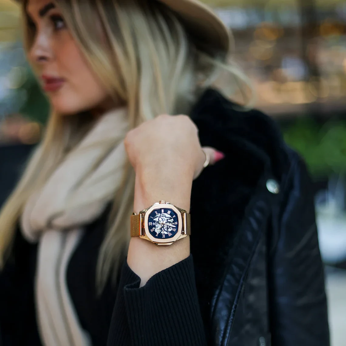 تتميز هذه الساعة بتصميم عصري وجريء يجمع بين الأناقة والفخامة، مع لمسة فريدة تكشف عن آليتها الداخلية. لون الذهب الوردي يمنحها مظهرًا دافئًا وراقيًا.