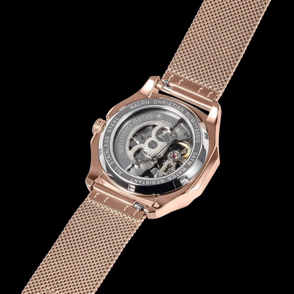 - المؤشرات والأرقام : تحتوي الساعة على أرقام رومانية كبيرة وواضحة، غالبًا ما تكون بلون الذهب الوردي، موضوعة على حلقة خارجية حول قاعدة الهيكلي. هذا التصميم يسهل قراءة الوقت مع الحفاظ على المظهر المعقد والمثير للاهتمام للآلية. يبرز شعار Ralph Christian الأنيق، الذي يتضمن زهرة الزنبق (Fleur-de-lis)، في الجزء العلوي من القاعدة .