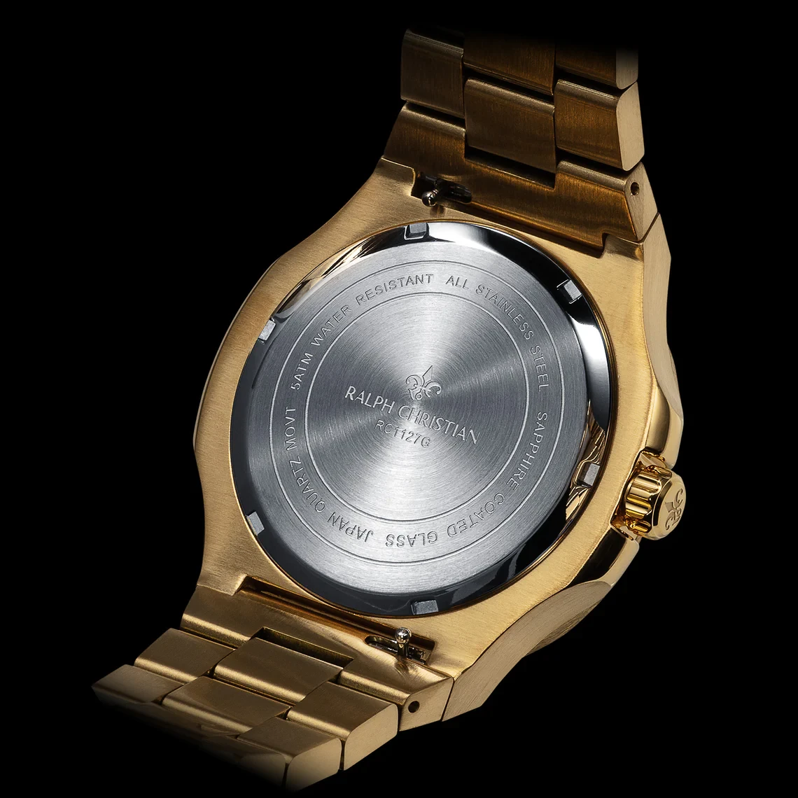 - العلامات والمؤشرات الأنيقة: تتميز الساعة بعلامات ساعات بيضاء بارزة وعقارب بيضاء أنيقة، مما يوفر تباينًا واضحًا مع الميناء الداكن ويسهل قراءة الوقت. يوجد شعار "Ralph Christian" أعلى مركز الميناء، مما يضيف لمسة من الهوية التجارية.