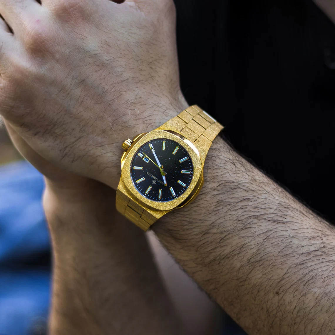 - الهيكل والسوار الذهبي اللامع : أكثر ما يلفت الانتباه هو اللون الذهبي الغني الذي يغطي الهيكل والسوار بالكامل. لكن ليس مجرد ذهب مصقول، بل يبدو أن السطح "مثلج" أو مغطى بطبقة من الجزيئات الصغيرة اللامعة التي تضفي عليها ملمسًا فريدًا وتألقًا مميزًا. هذا التشطيب يمنح الساعة شخصية جريئة وفاخرة .