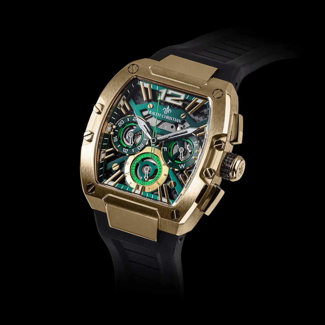ساعة يد رجالية رياضية وفاخرة من Ralph Christian، وهي من مجموعة "The Intrepid Sport"، وتحديداً "Gilded Black" (الأسود المذهب) . تتميز هذه الساعة بتصميمها الجريء الذي يجمع بين الطابع الرياضي والأناقة، وتلفت الانتباه بفضل تباين الألوان الأخضر والذهبي والأسود .