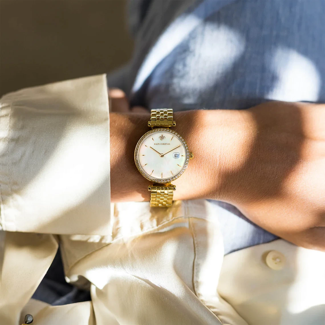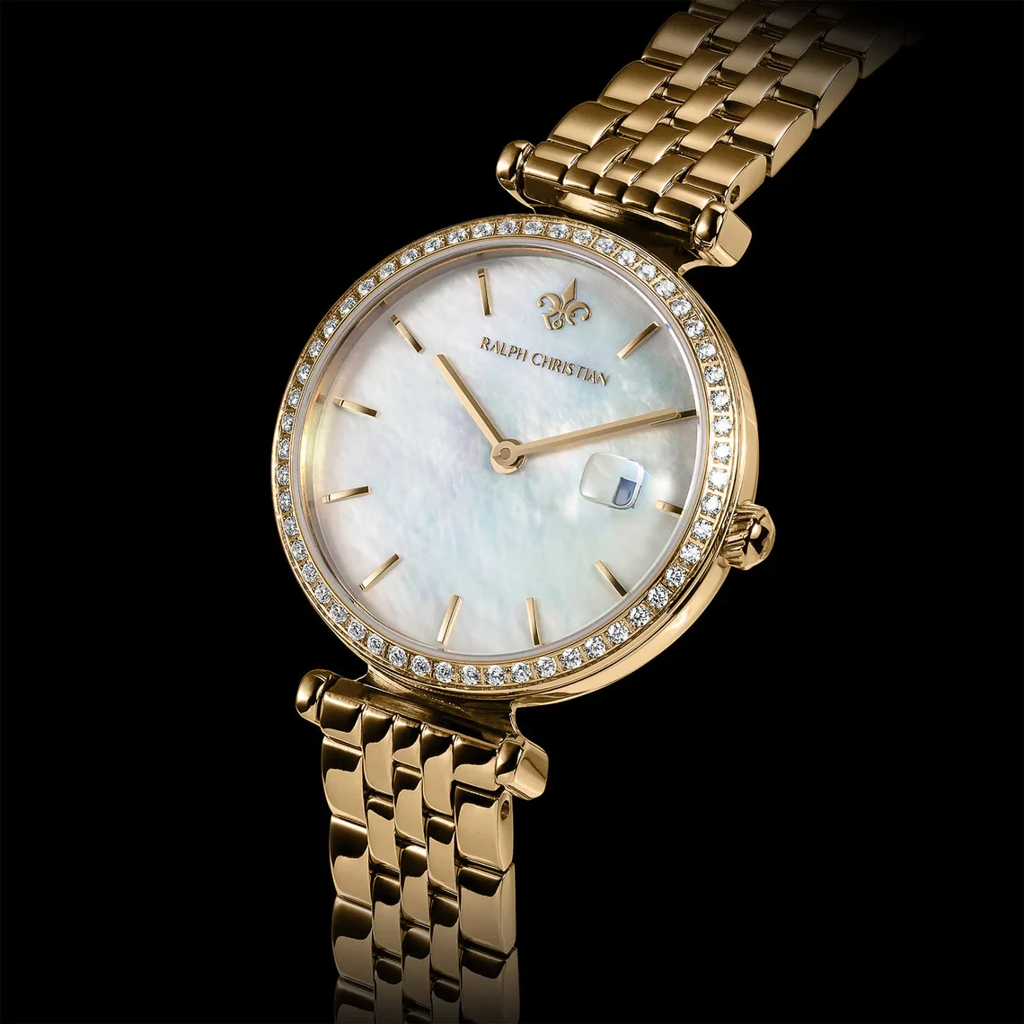 - القاعدة (القرص): باللون الأبيض اللؤلؤي أو الأبيض المصقول، وهو يعكس الضوء بطريقة جميلة ويضيف لمسة من الرقي. يظهر شعار Ralph Christian الأنيق، الذي يتضمن زهرة الزنبق (Fleur-de-lis) ، تحت الساعة 12، ويكون عادةً بلون ذهبي ليتناغم مع بقية الساعة.