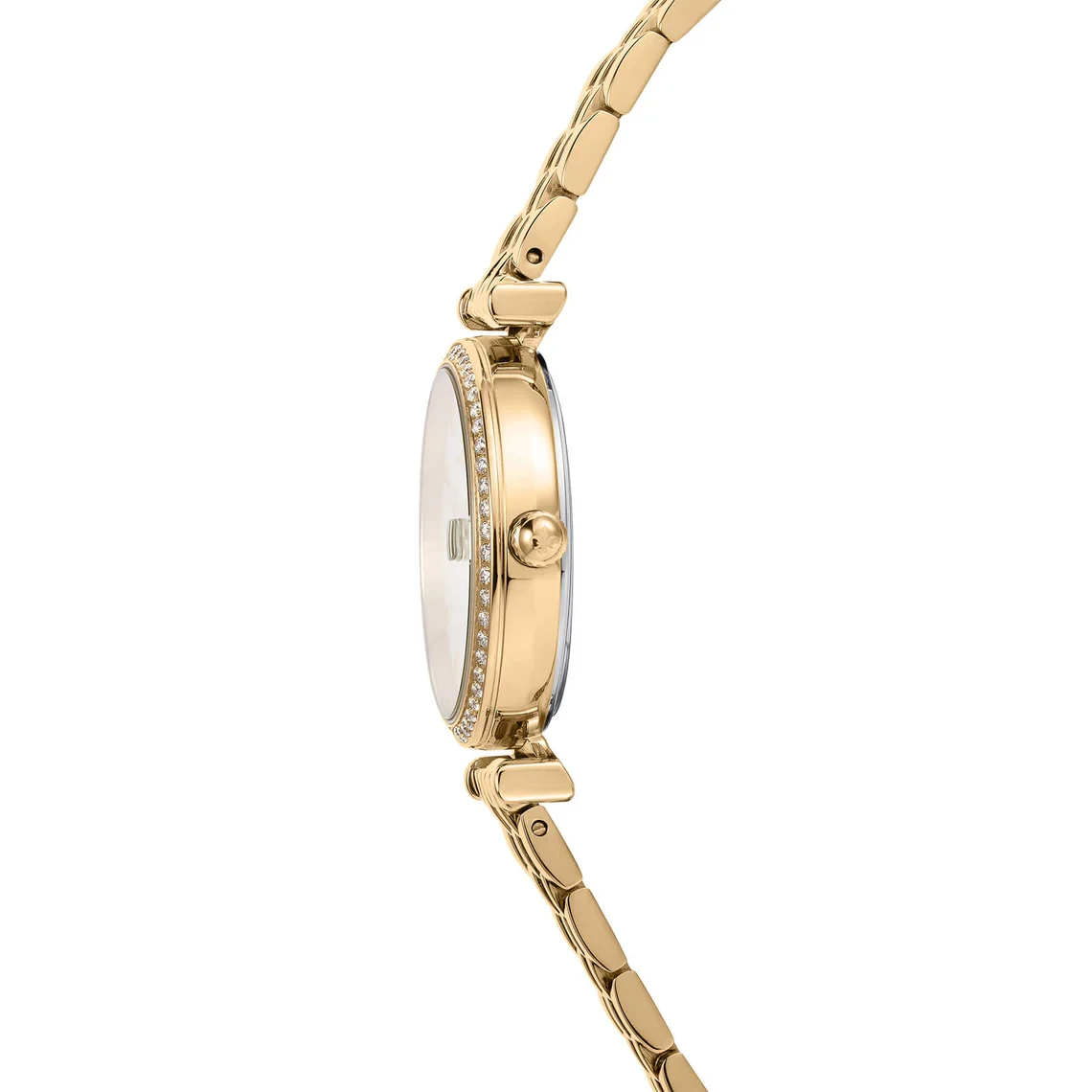 - الإطار (Bezel): يحيط إطار دائري مرصع بصفين من الكريستال اللامع، مما يضفي عليها بريقًا وتألقًا ويجعلها قطعة مجوهرات بحد ذاتها. الإطار نفسه يكون ذهبي اللون ليتناغم مع بقية الساعة.