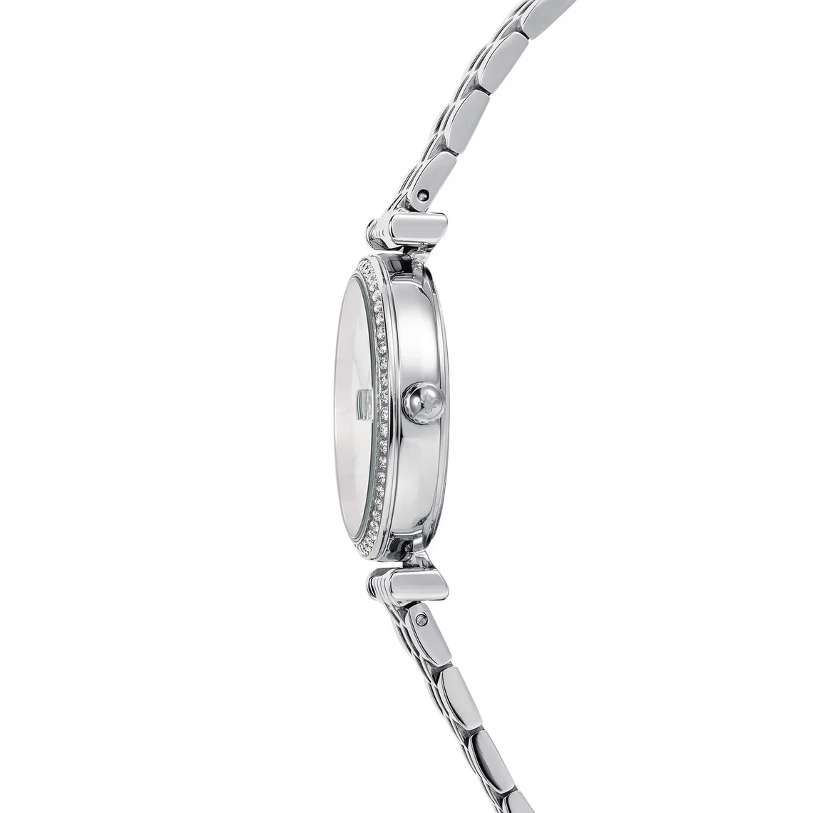 - الإطار (Bezel): يحيط بالميناء إطار دائري مرصع بصفين من الكريستال اللامع أو الألماس، مما يضفي عليها بريقًا وتألقًا ويجعلها قطعة مجوهرات بحد ذاتها. الإطار نفسه يكون فضي اللون ليتناغم مع بقية الساعة.