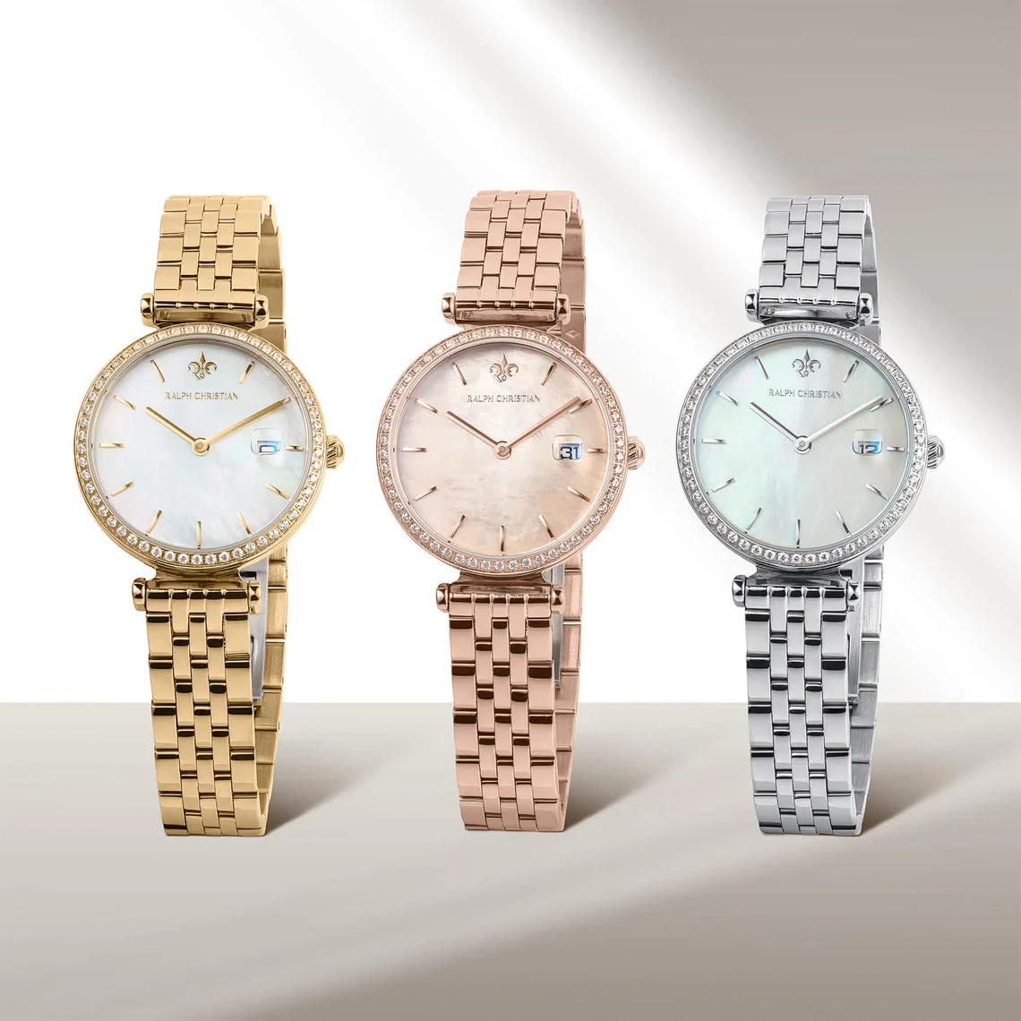 - القاعدة (القرص): باللون الأبيض اللؤلؤي أو الأبيض المصقول، وهو يعكس الضوء بطريقة جميلة ويضيف لمسة من الرقي. يظهر شعار Ralph Christian الأنيق، الذي يتضمن زهرة الزنبق (Fleur-de-lis)، تحت الساعة 12.