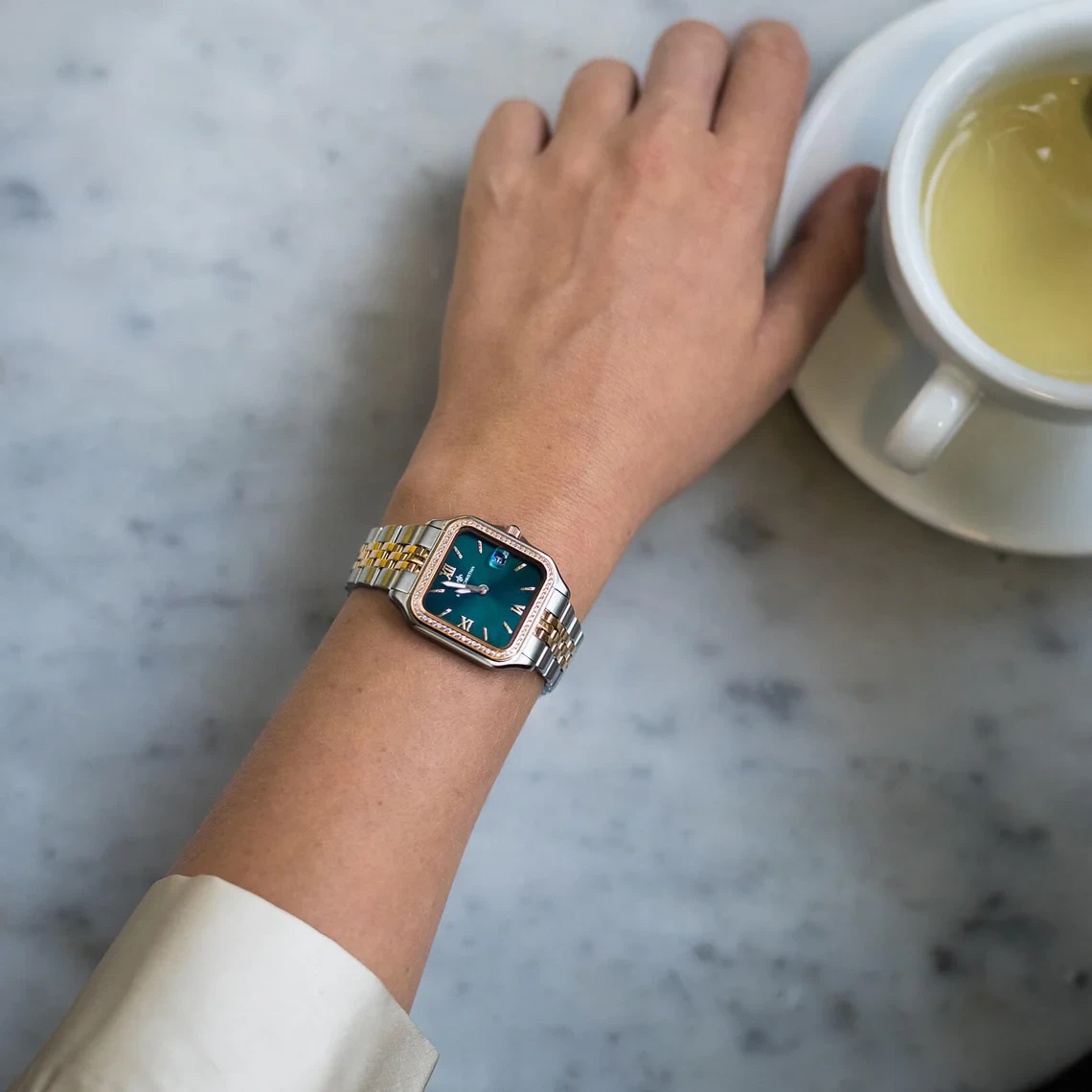 - الشكل والتصميم: تتميز الساعة بعلبة مربعة ذات زوايا مستديرة ناعمة، مما يمنحها مظهرًا أنيقًا ومميزًا يختلف عن الساعات الدائرية التقليدية. يعكس هذا التصميم الذوق الرفيع والاهتمام بالتفاصيل.