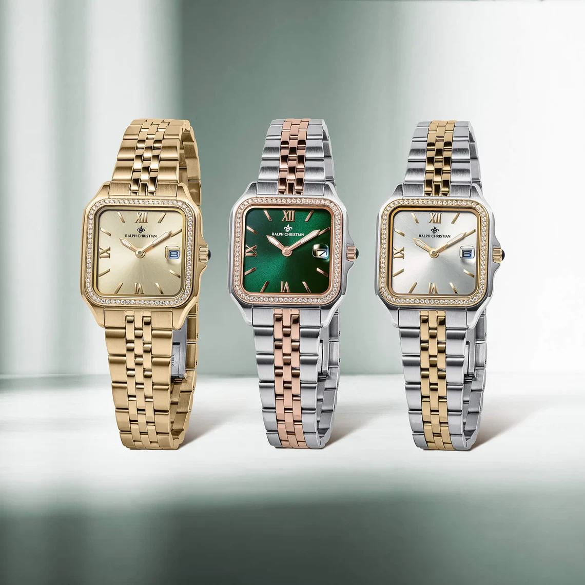 - المؤشرات والأرقام: تتميز الساعة بأرقام رومانية كبيرة على الساعة 12، 3، 6، و 9، وتكون عادةً بلون ذهبي وردي أو فضي ليتناغم مع باقي عناصر الساعة. أما بقية المؤشرات فتكون عبارة عن علامات بسيطة أو خطوط. يبرز شعار Ralph Christian الأنيق تحت الساعة 12.