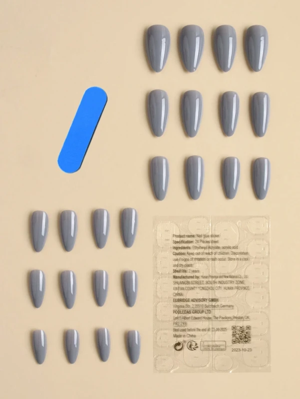 جميعها بلون رمادي موحد وجذاب، وبتصميم أنيق على شكل اللوز الطويل. هذا الشكل يُضفي على اليدين مظهرًا رشيقًا وممتدًا، واللون الرمادي يُعطي إحساسًا بالأناقة العصرية والرصانة. تُعد هذه الأظافر حلًا مثاليًا للحصول على مانيكير عصري ومميز، أو كقاعدة لابتكار تصاميم فنية خاصة بكِ، وذلك دون الحاجة لزيارة صالون التجميل. تأتي المجموعة مع مبرد أظافر لتسهيل التهيئة.
