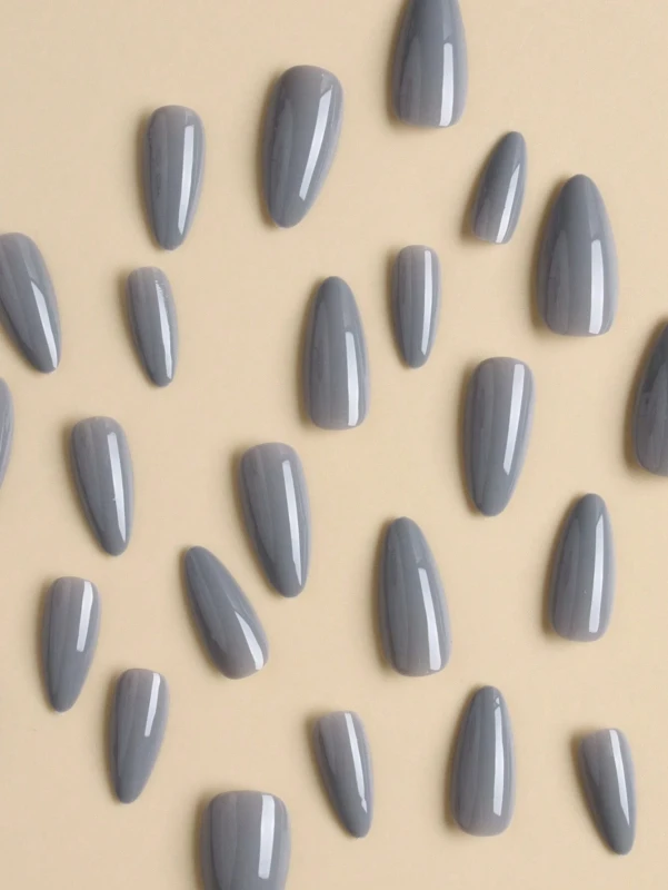 - أظافر لاصقة باللون الرمادي بشكل اللوز الطويل هي خيار أنيق وعملي للحصول على أظافر جذابة وعصرية بسرعة وسهولة. تُقدم لكِ هذه المجموعة الحل الأمثل لتجديد مظهر يديكِ بلمسة جمالية مميزة دون عناء، مع إمكانية التزيين حسب ذوقكِ.