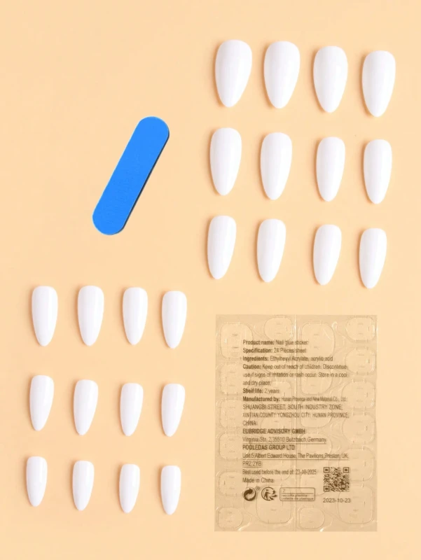جميعها بلون أبيض ناصع وموحد، وبتصميم أنيق على شكل اللوز الطويل. هذا الشكل يُضفي على اليدين مظهرًا رشيقًا وممتدًا، واللون الأبيض يُعطي إحساسًا بالنظافة والبساطة الراقية. تُعد هذه الأظافر حلًا مثاليًا للحصول على مانيكير عصري وجذاب، أو كقاعدة لابتكار تصاميم فنية خاصة بكِ، وذلك دون الحاجة لزيارة صالون التجميل. تأتي المجموعة مع مبرد أظافر صغير لتسهيل التهيئة.