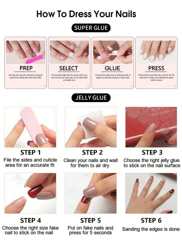 - ملحقات متكاملة: تأتي مع مبرد أظافر و"غراء جيلي" (مادة لاصقة على شكل جل) لتسهيل عملية التركيب.