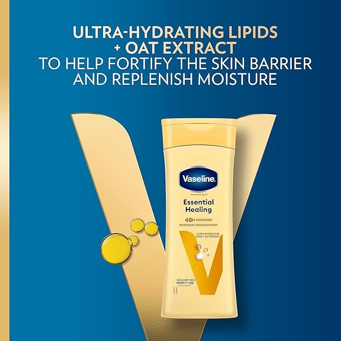 Vaseline Intensive Care Essential Healing Lotion هو لوشن يومي أساسي وفعال، يقدم حلاً شاملاً للبشرة الجافة. بتركيبته التي تجمع بين الدهون فائقة الترطيب ومستخلص الشوفان، فإنه يوفر ترطيباً عميقاً يدوم 48 ساعة، ويعالج الجفاف من أول استخدام، كل ذلك بلمسة نهائية غير دهنية. إذا كنتِ تبحثين عن منتج موثوق به، فعال، يمنح بشرتكِ الراحة، الصحة، والنعومة التي تستحقها، فهذا اللوشن هو خياركِ الأمثل.